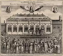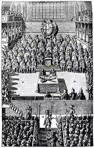 The High Court of Justice established by the Act consisted of 135 Commissioners, but many either refused to serve or chose to stay away.[196] Only 68 (all firm Parliamentarians) attended Charles's trial on charges of high treason and "other high crimes" that began on 20 January 1649 in Westminster Hall. The prosecution was led by Solicitor General John Cook.[197] Charles refused to enter a plea, claiming that no court had jurisdiction over a monarch.[198] He believed that his own authority to rule had been given to him by God and by the traditions and laws of England when he was crowned and anointed, and that the power wielded by those trying him was simply that of force of arms. Charles insisted that the trial was illegal, explaining, "Then for the law of this land, I am no less confident, that no learned lawyer will affirm that an impeachment can lie against the King, they all going in his name: and one of their maxims is, that the King can do no wrong."[199] When urged to enter a plea, he stated his objection with the words: "I would know by what power I am called hither, by what lawful authority...?"[198] The court, by contrast, proposed an interpretation of the law that legitimised the trial, which was founded on "...the fundamental proposition that the King of England was not a person, but an office whose every occupant was entrusted with a limited power to govern 'by and according to the laws of the land and not otherwise'."[200]