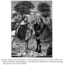 Charles's sister Bona married the eldest son of Philip VI of France, the future John II of France, in 1335. Thus, Charles was the maternal uncle of Charles V of France, who solicited his relative's advice at Metz in 1356 during the Parisian Revolt. This family connection was celebrated publicly when Charles made a solemn visit to his nephew in 1378, just months before his death. A detailed account of the occasion, enriched by many splendid miniatures, can be found in Charles V's copy of the Grandes Chroniques de France.