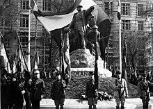 Mangin's monument was destroyed on 16 June 1940 (German troops had entered Paris only two days earlier).[6] During his tour of Paris, Adolf Hitler visited Napoleon's tomb, and the statue, being a reminder of Mangin's machinations in the Rhineland, was one of two he ordered destroyed. The other was of Edith Cavell. Mangin had guarded the Rhineland in 1920 with Senegalese troops and, supposedly "every German 'knew' that he ordered German mayors to provide brothels for his soldiers, and when the mayors protested at 'providing German women for Senegalese', Mangin was alleged to have replied, 'German women are none too good for my Senegalese'".[7] A German demolition squad dynamited his statue and most of the bronze was later melted down.[8] In 1957 a new statue was erected on the nearby Avenue de Breteuil.[9]