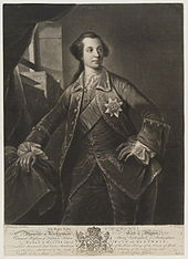 A descendant of the 1st Earl of Strafford, Lord Rockingham was brought up at the family home of Wentworth Woodhouse near Rotherham[1] in Yorkshire. He was educated at Westminster School.[2] During the Jacobite rising of 1745 Rockingham's father made him a colonel and organised volunteers to defend the country against the "Young Pretender".[3]:3 Rockingham's sister Mary wrote to him from London, saying the King "did not doubt but that you was as good a colonel as he has in his army" and his other sister Charlotte wrote that "you have gained immortal honour and I have every day the satisfaction of hearing twenty handsome things said of the Blues and their Collonel".[3]:3 The march of the Jacobite army into northern England caused the Wentworth household to flee to Doncaster and Rockingham rode from Wentworth to Carlisle to join the Duke of Cumberland in pursuit of the "Young Pretender". Rockingham did this without parental consent and Cumberland wrote to Rockingham's father, saying that his "zeal on this occasion shows the same principles fix't that you yourself have given such strong proofs of".[3]:3 Rockingham wrote to his father that Cumberland "blamed me for my disobedience, yet as I came with a design of saving my King and country...it greatly palliated my offence".[3]:3 Rockingham's mother wrote to his father: "Though I hope you won't tell it him, never any thing met with such general applause, in short he is the hero of these times, and his Majesty talks of this young Subject, in such terms, as must please you to hear...in the Drawing Room[4] no two people talk together, but he makes part of the discourse".[3]:4