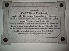 Charles William Ferdinand, Duke of Brunswick-Lüneburg, Prince of Brunswick-Wolfenbüttel (German: Karl Wilhelm Ferdinand; 9 October 1735 – 10 November 1806) was the Prince of Brunswick-Wolfenbüttel and Duke of Brunswick-Lüneburg and a military leader. His titles are usually shortened to Duke of Brunswick in English-language sources.
