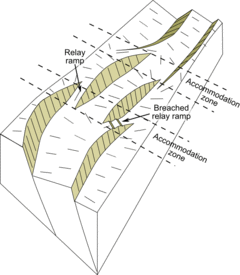 Accommodation zones take various forms, from a simple relay ramp at the overlap between two major faults of the same polarity, to zones of high structural complexity, particularly where the segments have opposite polarity. Accommodation zones may be located where older crustal structures intersect the rift axis. In the Gulf of Suez rift, the Zaafarana accommodation zone is located where a shear zone in the Arabian-Nubian Shield meets the rift.[6]