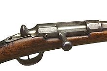 It was manufactured by Manufacture d'armes de Saint-Étienne (MAS), Manufacture d'Armes de Châtellerault (MAC), Manufacture d'Armes de Tulle (MAT) and, until 1870, in the Manufacture d'Armes de Mutzig in the former Château des Rohan. Many were also manufactured under contract in England (the "Potts et Hunts" Chassepots delivered to the French Navy), in Belgium (Liege), and in Italy at Brescia (by Glisenti). The approximate number of Chassepot rifles available to the French Army in July 1870 was 1,037,555 units.[2] Additionally, State manufacturies could deliver 30,000 new rifles monthly. Gun manufacturers in England and Austria also produced Chassepot rifles to support the French war effort. The Steyr armory in Austria delivered 12,000 Chassepot carbines and 100,000 parts to France in 1871.[3] Manufacturing of the Chassepot rifle ended in February 1875, four years after the end of the Franco-Prussian War, with approximately 700,000 more Chassepot rifles made between September 1871 and July 1874.[4]