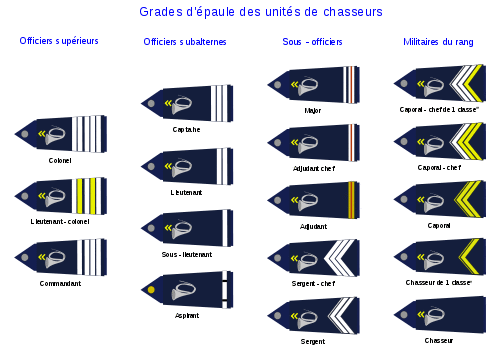 Note: the NCO ranks Brigadier and Maréchal-des-logis are not used in the chasseurs alpins corps since they belong to the infantry.