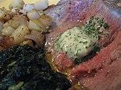 | Serving temperature | Hot (45 to 50 °C (113 to 122 °F)) for rare meat served either on a hot plank or on a platter |