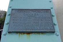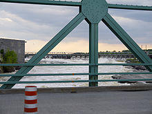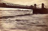 The Union Suspension Bridge, opened on September 17, 1843[2] (possibly September 17, 1844),[3] was a 242-foot (74 m) iron bridge built by Alexander Christie, and designed by Samuel Keefer[2] until 1889 when it was again rebuilt using steel truss construction. The current steel bridge was built by the Dominion Bridge Company in 1919.