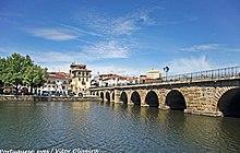 Artefacts discovered in the region of Chaves identify the earliest settlement of humans dating back to the Paleolithic.[4] Remnants discovered in Mairos, Pastoria and São Lourenço, those associated with transient proto-historic settlements and castros, show a human presence in the Alto Tâmega dating to the Chalcolithic.[4] The region has seen persistent human settlement since Roman legions conquered and occupied the fertile valley of the Tâmega River, constructing a nascent outpost and taking over the existing castros in the area. The settlement was located at the convergence of three important Roman roads: the Bracara Augusta, Asturica, and Lamecum that crossed the Roman Province of Gallaecia, linking Rome to the region's natural resources.[4] It was a military centre known for its baths, which lasted until the 16th century. This civilization constructed protective walls to protect the local population; spanned the river with the bridge;[5] promoted the baths (with its warm medicinal waters); exploited local mines and alluvial deposits and other natural resources. Its importance led to the urban nucleus being elevated to the status ofmunicipality in 79 AD, during the reign of the first Flavian Caesar, Titus Flavius Caesar Vespasianus Augustus.[4] Its benefactor consequently influenced its toponymy, becoming known as Aquae Flaviae. Artefacts from the area around the Matriz church indicate that Aquae Flaviae's centre was located in this place, in addition to an ancient headstone showing gladiatorial combat.[4][6]