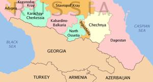 Chechnya (Russian: Чечня́, romanized: Chechnya; Chechen: Нохчийчоь, romanized: Noxçiyçö), officially the Chechen Republic (Russian: Чече́нская Респу́блика, romanized: Chechenskaya Respublika; Chechen: Нохчийн Республика, romanized: Noxçiyn Respublika), is a republic of Russia situated in the North Caucasus of Eastern Europe, close to the Caspian Sea. The republic is part of the North Caucasian Federal District, and shares land borders with the country of Georgia to its south; and borders the Russian republics of Dagestan to its east and north, Ingushetia and North Ossetia–Alania to its west; while sharing a border with Stavropol Krai to its northwest.
