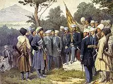 Under intermittent Persian rule since 1555, in 1783 the eastern Georgians of Kartl-Kakheti led by Erekle II and Russia signed the Treaty of Georgievsk. According to this treaty, Kartl-Kakheti received protection from Russia, and Georgia abjured any dependence on Iran.[32] In order to increase its influence in the Caucasus and to secure communications with Kartli and other Christian regions of the Transcaucasia which it considered useful in its wars against Persia and Turkey, the Russian Empire began conquering the Northern Caucasus mountains. The Russian Empire used Christianity to justify its conquests, allowing Islam to spread widely because it positioned itself as the religion of liberation from tsardom, which viewed Nakh tribes as "bandits".[33] The rebellion was led by Mansur Ushurma, a Chechen Naqshbandi (Sufi) sheikh—with wavering military support from other North Caucasian tribes. Mansur hoped to establish a Transcaucasus Islamic state under shari'a law. He was unable to fully achieve this because in the course of the war he was betrayed by the Ottomans, handed over to Russians, and executed in 1794.[34]