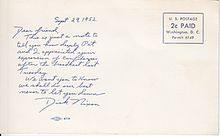 Nixon later characterized the attitude of his backers and aides as, "We want you to start campaigning right now for 1956, and we think the way to do it is to have available the funds to make speeches, make trips to California, and so forth."[2] Contributors were drawn only from his early supporters, and contributions were limited to $1,000 (equivalent to $10,000 in 2019). Nixon was not to be informed of the names of contributors; however, the fundraising letter stated that Nixon "will of course be very appreciative of your continuing interest."[4] By October 30, 1951, some $16,000 (equivalent to $158,000 in 2019) had been raised, of which Nixon had spent approximately $12,000 (equivalent to $118,000 in 2019), principally from contributors in the Los Angeles area.[5] The senator's Christmas card expense for 1950 and 1951 totaled $4,237.54 (equivalent to $41,700 in 2019).[6] Despite the initial fundraising success, only $2,200 could be raised from November 1951 to July 1952, and an engraving bill was unpaid pending a hoped-for contribution of $500.[5]