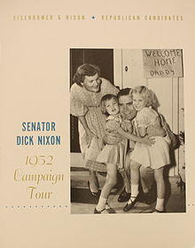 By this time, Nixon campaign headquarters was receiving a flood of messages, calling on the senator to resign from the ticket.[23] When Eisenhower's train stopped for the candidate to make speeches, he faced protesters with signs reading "Donate Here to Help Poor Richard Nixon."[24] The influential Washington Post and New York Herald-Tribune both called for Nixon to leave the ticket, facts which Chotiner did not tell his candidate; Nixon learned them from a questioning reporter. Over 100 newspapers would editorialize about the Fund on the morning of September 20, opinion running two to one against Nixon.[25] As his train stopped in Eugene, Oregon, Nixon was met with protestors' signs referencing his wife: "Pat, What Are You Going to Do With the Bribe Money?" and "No Mink Coats for Nixon—Just Cold Cash." He angrily responded with a phrase which would be echoed in the Checkers speech. After stating that there were no mink coats for the Nixons, the candidate said that he was "proud of the fact that Pat Nixon wears a good Republican cloth coat, and she's going to continue to."[24]