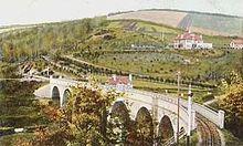 Chelfham Viaduct is a railway viaduct built in 1896–97 to carry the Lynton and Barnstaple Railway (L&B) across the Stoke Rivers valley. Designed by L&B engineer, FW Chanter, and containing over a quarter of a million Marland bricks, its eight arches - each 42 feet (13 m) wide and 70 feet (21 m) high - meaning that the 132-yard (121 m)-long viaduct is the largest narrow gauge railway structure in England.[1] Chelfham Viaduct was Bridge number 22 of the 80 that carried or spanned the railway over its 19-mile (31 km) length. The viaduct was classified as a Grade II listed structure on 25 February 1965.[2]