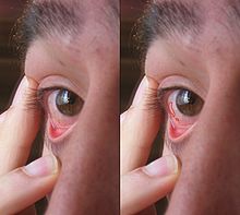 Chemosis is the swelling (or edema) of the conjunctiva. The term derives from the Greek chem- meaning chemical[1] and -osis meaning denoting action.[2] A chemical reaction, or in this case, a chemical reaction of the conjunctiva which is due to the oozing of exudate from abnormally permeable capillaries. In general, chemosis is a nonspecific sign of eye irritation. The outer surface covering appears to have fluid in it. The conjunctiva becomes swollen and gelatinous in appearance. Often, the eye area swells so much that the eyes become difficult or impossible to close fully.[3] Sometimes, it may also appear as if the eyeball has moved slightly backwards from the white part of the eye due to the fluid filled in the conjunctiva all over the eyes except the iris. The iris is not covered by this fluid and so it appears to be moved slightly inwards.