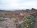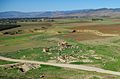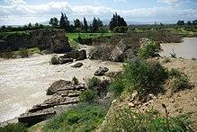 The Roman bridge over the Medjerda is considered to be the largest Roman bridge in North Africa and has an outstanding importance from an architectural and engineering perspective. It led the Roman road between Thuburnica and Sicca Veneria across the Medjerda near Simitthus. In the swampland of the highly meandering river, the difficult foundations and the recurring floods made the construction a risky undertaking. In the 1st century AD the first attempt was made to build bridges, but this first bridge did not extend beyond the century. In 112 AD, a new building was erected by Trajan, as can be found in an inscription (now in the Chimtou Museum). The river was temporarily diverted to build the bridge. A 30 meter wide and 1.5 meter thick foundation slab made of wooden crates filled with a lime-mortar-stone mixture (Caementicium) was placed on the river bed. Their top was secured with a covering of stone blocks. This construction, was heavily stressed by the strongly changing water flow and was therefore strengthened later. However, the fortifications could not stop the plateau from being submerged, which eventually led to the collapse of the bridge in the 4th century.[4] Since then the remains of the building form an impressive rubble field.