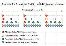 If a performer starts with a 3 beat and completes these beats in 4 seconds (geometric speed), it is called an "Onnam Kaalam" (ഒന്നാം കാലം) of 3 beats. So the "Randam Kaalam" (രണ്ടാം കാലം) beats would be multiple of "Onnam Kaalam", 6 beats completed in 4 seconds. "Muunaam Kaalam" (മൂനാം കാലം) would be multiple of "Randam Kaalam", 12 beats completed in 4 seconds, "Naalam Kaalam" (നാലാം കാലം) would be 24 beats completed in 4 seconds and so on. Similarly if the performer starts with 4 beats and completes the beats in 4 seconds, then "Randam Kaalam" beats would be multiple of "Onnam Kaalam", 8 beats completed in 4 seconds, "Muunaam Kaalam" would be multiple of "Randam Kaalam", 16 beats completed in 4 seconds. If the performer starts with the same 4 beats and completes the beats in 2 seconds, then "Randam Kaalam" would be 8 beats and should be completed in 2 seconds, "Muunaam Kaalam" would be 16 beats and should be completed in 2 seconds.