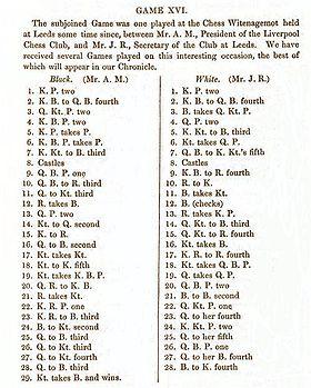 The notation for chess moves evolved slowly, as these examples show. The last is in algebraic chess notation; the others show the evolution of descriptive chess notation and use spelling and notation of the period.