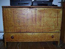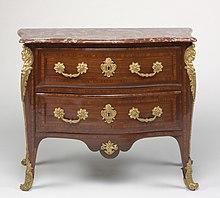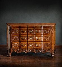 In late medieval Europe the chest came into widespread use, especially in homes of the nobility. This type, also known as a coffer was more or less a simple joined wooden box with a hinged lid. It may or may not have stood on feet. An early transitional phase was the installation of one drawer beneath this main compartment. A number of early pieces from the seventeenth century are extant of oak manufacture from England, and corresponding seventeenth century pieces of French walnut have survived. Some of the early surviving English specimens are from the Charles I period. Nutting ascribes the earliest piece in his Furniture Treasury to "before 1649".[3]