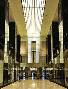 In 2005, the building underwent an extensive $20 million renovation directed by Chicago architect Gunny Harboe, whose restoration work included Loop landmarks the Rookery Building and Reliance Building. The project included restoration of the main lobby to emphasize the design features of the art deco era, elevator modernization, façade renovation and cleaning, and the continued renovation of upper floor corridors and hallways.[35][36] Though impractically small for modern use, mailboxes in the lobby were restored to their original condition to follow the theme of vertical lines found throughout the complex.[37] An improved electrical infrastructure, with ten main feeds from seven different Commonwealth Edison electrical substations, was added in addition to redundant cooling systems and upgraded telecommunications capabilities.
