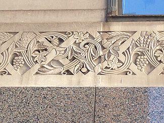 Sculptural work by Alvin Meyer, the one-time head of Holabird & Root's sculpture department, is prominent on the building's façade, and represents the trading activities within. On each side of the 13 ft (4.0 m) diameter clock facing LaSalle Street are hooded figures, a Babylonian holding grain and a Native American holding corn.[21][22][23] Similar figures are repeated at the uppermost corners of the central tower, just below the sloping roof. About 30 ft (9.1 m) above street level, representations of bulls protrude directly from the limestone cladding on the building's north side and to a lesser degree on the east side, a reference to a bull market.