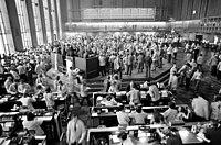 According to the June 16, 1930 issue of Time magazine, visitors carrying ripened wheat heads stared in curiosity at the six-story tall trading room directly above the lobby and behind the large windows below the clock facing LaSalle Street. At the center of the room, Time reported on the items being traded in "pits" organized based on commodities type with pits names such as the corn pit, soybean pit or wheat pit. The individual pits are raised octagonal structures where open outcry trading occurs. Steps up the outside of each octagon provide an amphitheater atmosphere, and enable a large number of traders to see each other and communicate during trading hours. With early versions dating back to 1870, this type of trading pit was patented in 1878.[2]