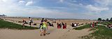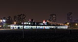 Montrose beach is Chicago's largest beach. It is located in Uptown.[18] It also houses the most parking of any beach in Chicago. It is one of few beaches where patrons may launch non-motorized watercraft, such as kayaks and catamarans, into Lake Michigan. It also has one of only two dog beaches in the Chicago Park District, making it a popular beach for dog lovers. In the fenced-off section at the north end of the beach, leashless dogs are permitted on the sand. Montrose beach hosts the Junior Guard regional championships, the annual Beach Soccer Festival, and numerous runs and walks for various charities. The beach house on the south end of the beach was designed by E.V. Buchsbaum. It was modeled after the North Avenue Beach house and looks like a lake steamer. Unfortunately, in the 1950s, the east wing of the beach house burned in a fire and was not rebuilt.[19] The beach house was remodeled with a 3,000-square-foot (280 m2) patio deck, and it will house only the third full-service restaurant, named "The Dock at Montrose Beach", at a Chicago beach after Oak Street Beachstro and North Avenue's Castaways. It is part of the Park District's plan to add "more upscale concessions to the lakefront".[20] Due to budget constraints Chicago eliminated the traditional July 3 fireworks in Grant Park, instead opting for a down-scaled fireworks displays in three different locations in Chicago on the 4th of July. The north side display is held annually at Montrose Beach.[21]
