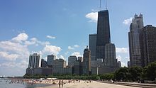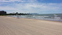 The beaches in Chicago are an extensive network of waterfront recreational areas operated by the Chicago Park District. The Chicago metropolitan waterfront includes parts of the Lake Michigan shores as well as parts of the banks of the Chicago, Des Plaines, Calumet, Fox, and DuPage Rivers and their tributaries.[1] The waterfront also includes the Illinois and Michigan Canal and the Sanitary and Ship Canal.[1] Historically, the waterfront has been used for commerce, industry, and leisure. Leisure, such as fishing, swimming, hunting, walking and boating, was much more prevalent throughout the river sections of the waterfront system early in the 19th century before industrial uses altered the landscape. By midcentury, much leisure shifted to Lake Michigan as a result of industrial influence. The first City of Chicago Public Beach opened in Lincoln Park in 1895.[2] Today, the entire 28 miles (45 km) Chicago lakefront shoreline is man-made, and primarily used as parkland.[3] There are 24 beaches in Chicago along the shores of freshwater Lake Michigan.[4]