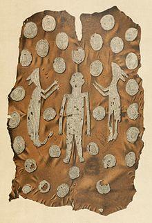 "Powhatan's Mantle" is the name given to a cloak of deerskin, decorated with shell patterns and figures, held by the Ashmolean Museum, Oxford. It allegedly belonged to Powhatan, although the evidence is questionable. The Mantle is certainly one of the earliest North American artifacts to have survived in a European collection. It must have originally belonged to a Native American of high social status, as it was decorated with numerous valuable native shell beads.[12]