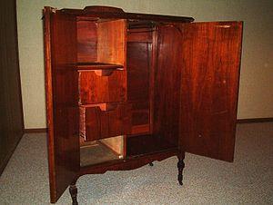 A chifforobe (/ˈʃɪfəˌroʊb/), also chiffarobe or chifferobe, is a closet-like piece of furniture that combines a long space for hanging clothes (that is, a wardrobe or armoire) with a chest of drawers.[1] Typically the wardrobe section runs down one side of the piece, while the drawers occupy the other side.[2] It may have two enclosing doors or have the drawer fronts exposed and a separate door for the hanging space.[2][3]