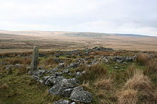 In the early 19th century there was much interest in enclosing and "improving" the open moorland on Dartmoor, encouraged by Sir Thomas Tyrwhitt's early successes at Tor Royal near Princetown.[6] Enclosure was aided by the greatly enhanced access provided by the construction of the first turnpike roads over the moor: the road between Ashburton and Two Bridges opened in around 1800, for instance.[7] In February 1809 one Thomas Windeatt, from Bridgetown, Totnes, took over the lease of a plot of land (a "newtake") of about 582 acres in the valley of the River Swincombe. In 1812 Windeatt started to build a farmhouse, Fox Tor Farm, on his land and his workmen robbed the nearby Childe's Tomb of most of its stones for the building and its doorsteps.[8][9]