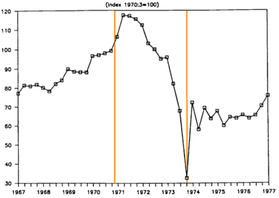 The falls in exports were mostly due to a fall in the price of copper. Chile was at the mercy of international fluctuations in the value of its single most important export. As with almost half of developing countries, more than 50 percent of Chile's export receipts were from a single primary commodity.[17] Adverse fluctuation in the international price of copper negatively affected the Chilean economy throughout 1971-72. The price of copper fell from a peak of $66 per ton in 1970 to only $48–49 in 1971 and 1972.[18] In addition to the hyperinflation, the fall in the value of copper and lack of economic aid would further depress the economy.