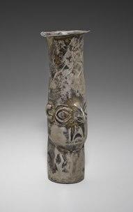 Metalworking picked up quickly in the Late Chimú periods.[12] The Chimú worked with metals such as gold, silver, and copper.[25] Some Chimú artisans worked in metal workshops divided into sections for each specialized treatment of metals: plating, gold, stamping, lost-wax, pearl, the watermark, and embossing wooden molds. These techniques produced large variety of objects, such as cups, knives, containers, figurines, bracelets, pins, and crowns. They used arsenic to harden the metals after they were cast. Large-scale smelting took place in a cluster of workshops at Cerro de los Cemetarios.[12] The process starts with ore extracted from mines or a river, which is heated to very high temperatures and then cooled. The result is a group of prills, such as small round sections of copper, in a mass of slag, which are other materials which are not useful for metallurgy. The prills are then extracted by crushing the slag, and then melted together to form ingots, which were fashioned into various items. The Chimú also shaped metals through hammering, as displayed in the image on the right of the silver Chimú beaker. Chimú metalsmiths achieved this technique with simple tools and a single sheet of gold. The artist would first carve a wooden mold. Then they would carefully hammer the paper-thin sheet of gold around the wooden base.[26]
