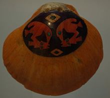 The difficult task of shell diving is captured in the imagery of many portable Andean artifacts, such as bowls, earspools, and textiles.[15] Many of these images are similar, illustrating a boat with sailors holding cords attached to the divers in the water. Stone weights are suspended from the divers as they gather shells, and portrayals of Spondylus often emphasize their characteristic spines.[18] The image to the right features a Chimú earspool, which was molded from gold-copper and silver alloys and depicts a shell diving scene. The rectangle in the upper half of the earspool is a boat with large sails, and birds reside at the top of the piece. Four divers swim beneath the boat and are near spiky eggshell-shaped shells.[21]