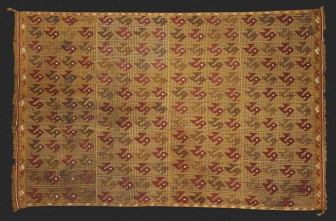 The majority of Chimú textiles were made from alpaca wool and cotton.[12][18] Judging from the uniform spin direction, degree of the twist, and colors of the threads, it is likely that all of the fibers were pre-spun and imported from a single location.