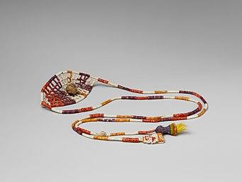 Spondylus shell had a wide variety of uses in Andean culture and took a variety of forms, ranging from whole shells to fragments to ground shell powder.[16] This material was worked to create intricately carved ornaments, tools, and goods reserved for the nobles and deities. Shell fragments have been found as inlays for body ornaments and as beads for pieces of jewelry. The image to the right displays a Chimú collar made of cotton, red Spondylus shell beads, and black stone beads,[17] and the image below displays a sling shot made of shell. Representing wealth and power, the shell was ground into powder and spread out before the Chimor king by an official called the Fonga Sigde, forming a “red carpet” for the ruler as he walked.[18] Shell were likewise used for ornamentation of certain buildings and architectural structures.[15]