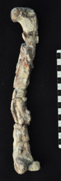 PEFO 10395 mainly consists of vertebrae, limb bones, and hip fragments. Vertebrae include several partial cervical (neck) dorsal (back), and caudal (tail) vertebrae, along with two sacral (hip) vertebrae, a chevron, and rib fragments. Each of the three bones making up the hip (the ilium, pubis, and ischium) are represented by isolated fragments. Leg bones include a complete right femur, the upper part of the left femur, an incomplete right tibia, and a right astragalus bone of the ankle.[1][3] A single serrated tooth has also been considered as part of the specimen,[7] but this may be in error.[8]