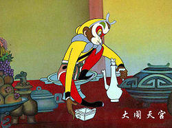 In the 1920s, the pioneering Wan brothers believed that animations should emphasize on a development style that was uniquely Chinese. This rigid philosophy stayed with the industry for decades. Animations were essentially an extension of other facets of Chinese arts and culture, drawing more contents from ancient folklores and manhua. An example of a traditional Chinese animation character would be Monkey King, a character transitioned from the classic literature Journey to the West to the 1964 animation Havoc in Heaven. Also drawing on tradition was the ink-wash animation developed by animators Te Wei and Qian Jiajun in the 1960s. Based on Chinese ink-wash painting, several films were produced in this style, starting with Where is Mama (1960).[5] However, the technique was time-consuming and was gradually abandoned by animation studios.[6]
