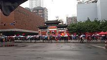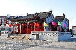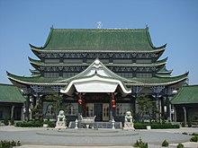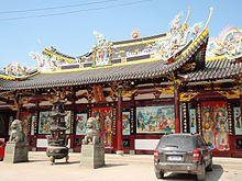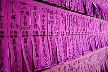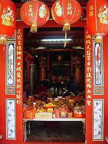 Another dimension of the Chinese folk religion is based on family or genealogical worship of deities and ancestors in family altars or private temples (simiao Chinese: 私廟 or jiamiao Chinese: 家廟), or ancestral shrines (citang Chinese: 祠堂 or zongci Chinese: 宗祠, or also zumiao Chinese: 祖廟).[126] Kinship associations or churches (zōngzú xiéhuì Chinese: 宗族協會), congregating people with the same surname and belonging to the same kin, are the social expression of this religion: these lineage societies build temples where the deified ancestors of a certain group (for example the Chens or the Lins) are enshrined and worshiped.[127] These temples serve as centres of aggregation for people belonging to the same lineage, and the lineage body may provide a context of identification and mutual assistance for individual persons.[127]