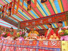 These societies organise gatherings and festivals (miaohui Chinese: 廟會) participated by members of the whole village or larger community on the occasions of what are believed to be the birthdays of the gods or other events,[54] or to seek protection from droughts, epidemics, and other disasters.[54] Such festivals invoke the power of the gods for practical goals to "summon blessings and drive away harm".[54] Special devotional currents within this framework can be identified by specific names such as Mazuism (Chinese: 媽祖教 Māzǔjiào),[121] Wang Ye worship, or the cult of the Silkworm Mother.[122]