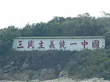 Kinmen has a prominent white wall with giant red characters "三民主義統一中國" meaning "Reunify China under Three Principles of the People.