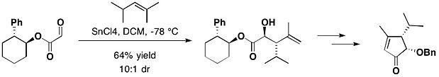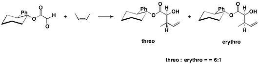 In the total synthesis of (−)-heptemerone B and (−)-guanacastepene E, attached with trans-2-phenylcyclohexanol, the glyoxylate reacted with 2,4-dimethyl-pent-2-ene, in the presence of tin(IV) chloride, yielding the desired anti adduct as the major product, together with a small amount of its syn isomer with 10:1 diastereomeric ratio.[16]