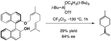 Hisashi Yamamoto first utilized (R)-BINOL as a chiral auxiliary in the asymmetric synthesis of limonene, which is an example of cyclic mono-terpenes. (R)-BINOL mononeryl ether was prepared by the monosilylation and alkylation of (R)-BINOL as the chiral auxiliary. Followed with the reduction by organoaluminum reagent, limonene was synthesized with low yields (29% yield) and moderate enantiomeric excesses up to 64% ee.[12]