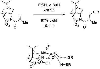 Camphorsultam also acts as a chiral auxiliary in Michael addition. Lithium base promoted stereoselective Michael addition of thiols to N-mcthacryloylcamphorsultam produced the corresponding addition products in high diastereoselectivity.[23]