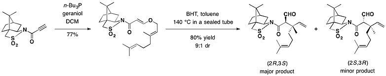 Camphorsultam was used as a chiral auxiliary for the asymmetric Claisen rearrangement. In the presence of butylated hydroxytoluene (BHT) used as a radical scavenger, a toluene solution of the adduct between geraniol and camphorsultam was heated in a sealed tube at 140 °C, to provide mainly the (2R,3S)-isomer as the major rearrangement product in 72% yield, securing the two contiguous stereocenters including the quaternary carbon.[24]
