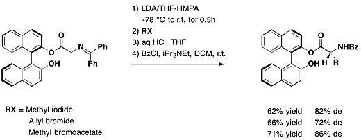 The preparation of a variety of enantiomerically pure uncommon R-amino acids can be achieved by the alkylation of chiral glycine derivatives possessing axially chiral BINOL as an auxiliary. It has been depicted by Fuji et al. Based on different electrophile, the diastereomeric excess varied from 69% to 86.[13]