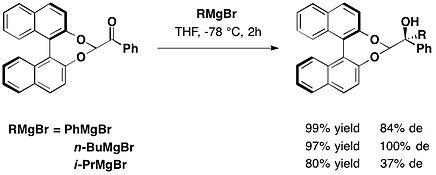 Protected at the aldehyde function with (R)-BINOL, arylglyoxals reacted diastereoselectively with Grignard reagents to afford protected atrolactaldehyde with moderate to excellent diastereomeric excess and high yields.[14]