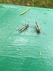 This is a large taxon of insects; some estimates of the species numbers suggest well over 10 000 world-wide.[1] Males are easily recognized by their plumose antennae. Adults are known by a variety of vague and inconsistent common names, largely by confusion with other insects. For example, chironomids are known as "lake flies" in parts of Canada and Lake Winnebago, Wisconsin, but "bay flies" in the areas near the bay of Green Bay, Wisconsin. They are called "sand flies", "muckleheads",[2] "muffleheads",[3] "Canadian soldiers",[4] or "American soldiers"[5] in various regions of the Great Lakes area. They have been called "blind mosquitoes" or "chizzywinks" in Florida.[6] However, they are not mosquitoes of any sort, and the term "sandflies" generally refers to various species of biting flies unrelated to the Chironomidae.