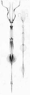 Right: A mature Chiroteuthis veranyi: This species has some of the longest tentacles in proportion to its size of any known cephalopod.
