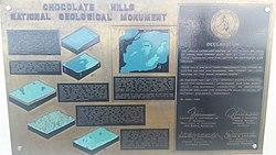 The origin for the conical karst of the Chocolate Hills is described in popular terms on the bronze plaque at the viewing deck in Carmen, Bohol. This plaque states that they are eroded formations of a type of marine limestone that sits on top of hardened clay.[13][14] The plaque reads:
