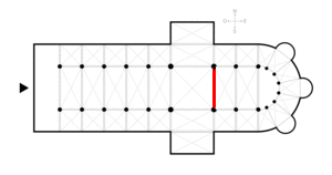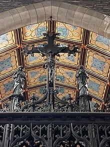 The word rood is derived from the Saxon word rood or rode, meaning "cross". The rood screen is so called because it was surmounted by the Rood itself, a large figure of the crucified Christ. Commonly, to either side of the Rood, there stood supporting statues of saints, normally Mary and St John,[4] in an arrangement comparable to the Deesis always found in the centre of an Orthodox iconostasis (which uses John the Baptist instead of the Apostle, and a Pantokrator instead of a Crucifixion). Latterly in England and Wales the Rood tended to rise above a narrow loft (called the "rood loft"), which could occasionally be substantial enough to be used as a singing gallery (and might even contain an altar); but whose main purpose was to hold candles to light the rood itself.[5] The panels and uprights of the screen did not support the loft, which instead rested on a substantial transverse beam called the "rood beam" or "candle beam".[6] Access was via a narrow rood stair set into the piers supporting the chancel arch. In parish churches, the space between the rood beam and the chancel arch was commonly filled by a boarded or lath and plaster tympanum, set immediately behind the rood figures and painted with a representation of the Last Judgement.[7] The roof panels of the first bay of the nave were commonly richly decorated to form a celure or canopy of honour; or otherwise there might be a separate celure canopy attached to the front of the chancel arch.