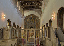 Until the 6th century the altar of Christian churches would have been in full view of the congregation, separated only by a low altar rail around it. Large churches had a ciborium, or canopy on four columns, over the altar, from which hung altar curtains which were closed at certain points in the liturgy. Then however, following the example of the church of Hagia Sophia in Constantinople, churches began to surround their altars with a colonnade or templon which supported a decorated architrave beam along which a curtain could be drawn to veil the altar at specific points in the consecration of the Eucharist; and this altar screen, with widely spaced columns, subsequently became standard in the major churches of Rome. In Rome the ritual choir tended to be located west of the altar screen, and this choir area was also surrounded by cancelli, or low chancel screens. These arrangements still survive in the Roman basilicas of San Clemente and Santa Maria in Cosmedin, as well as St Mark's Basilica in Venice.[11] In the Eastern Church, the templon and its associated curtains and decorations evolved into the modern iconostasis. In the Western Church, the cancelli screens of the ritual choir developed into the choir stalls and pulpitum screen of major cathedral and monastic churches; but the colonnaded altar screen was superseded from the 10th century onwards, when the practice developed of raising a canopy or baldacchino, carrying veiling curtains, over the altar itself.